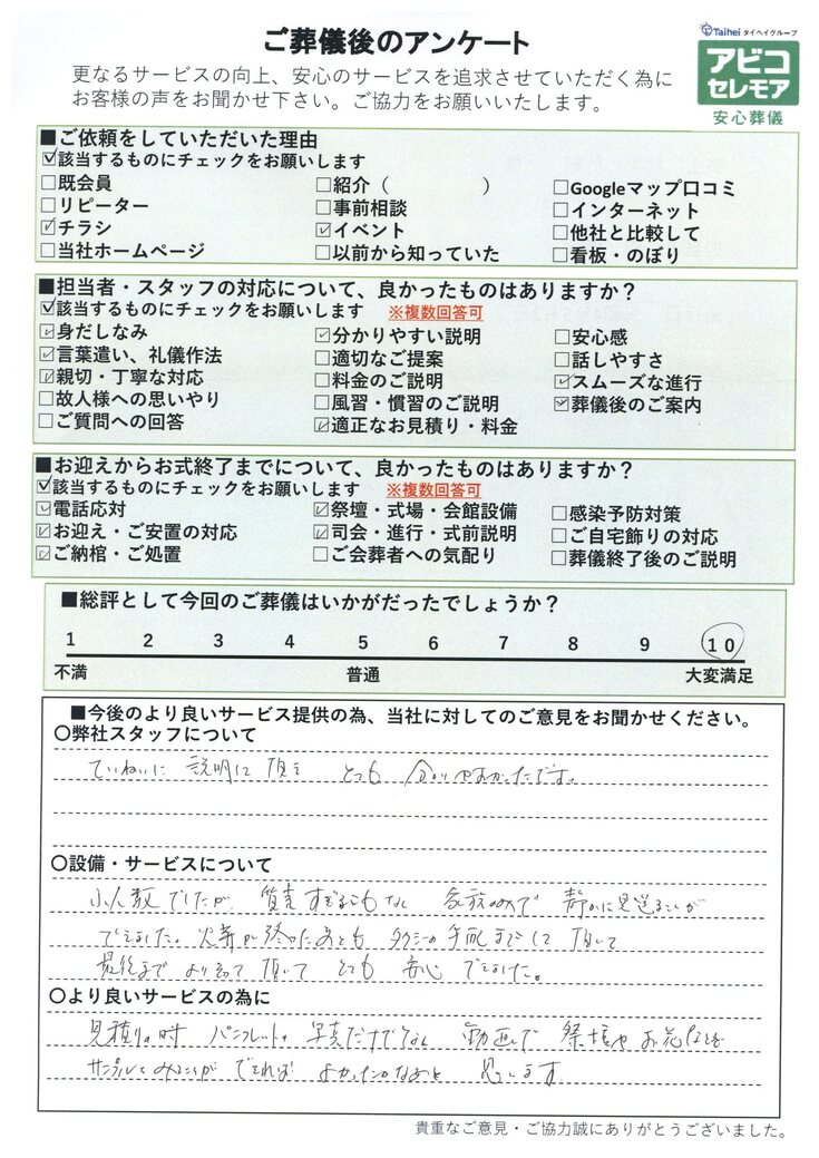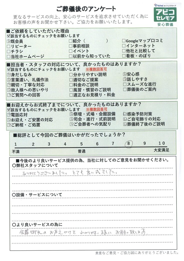 トップページへ戻る / 安心の理由 / お客様の声 お客様の声 アビコセレモアではお客様の声を掲載させていただいております。「ありがとう」のお声も、「ご指摘や厳しい」お声も皆様にそのまま正直にお伝えしたいと考えているからです。そして日々お客様の声から、更により良いサービスのご提供が出来る様、真摯に受け止め、日々改善し、お客様目線のお手伝いをすべく邁進しております。 NEW No.300 NEW No.299 NEW No.298 NEW No.297 NEW No.296 NEW No.295 No.294 No.293 12345next > 家族葬密葬 一日葬 一般葬 火葬式(直葬) 福祉葬 永代供養付の葬儀 ご搬送のみ